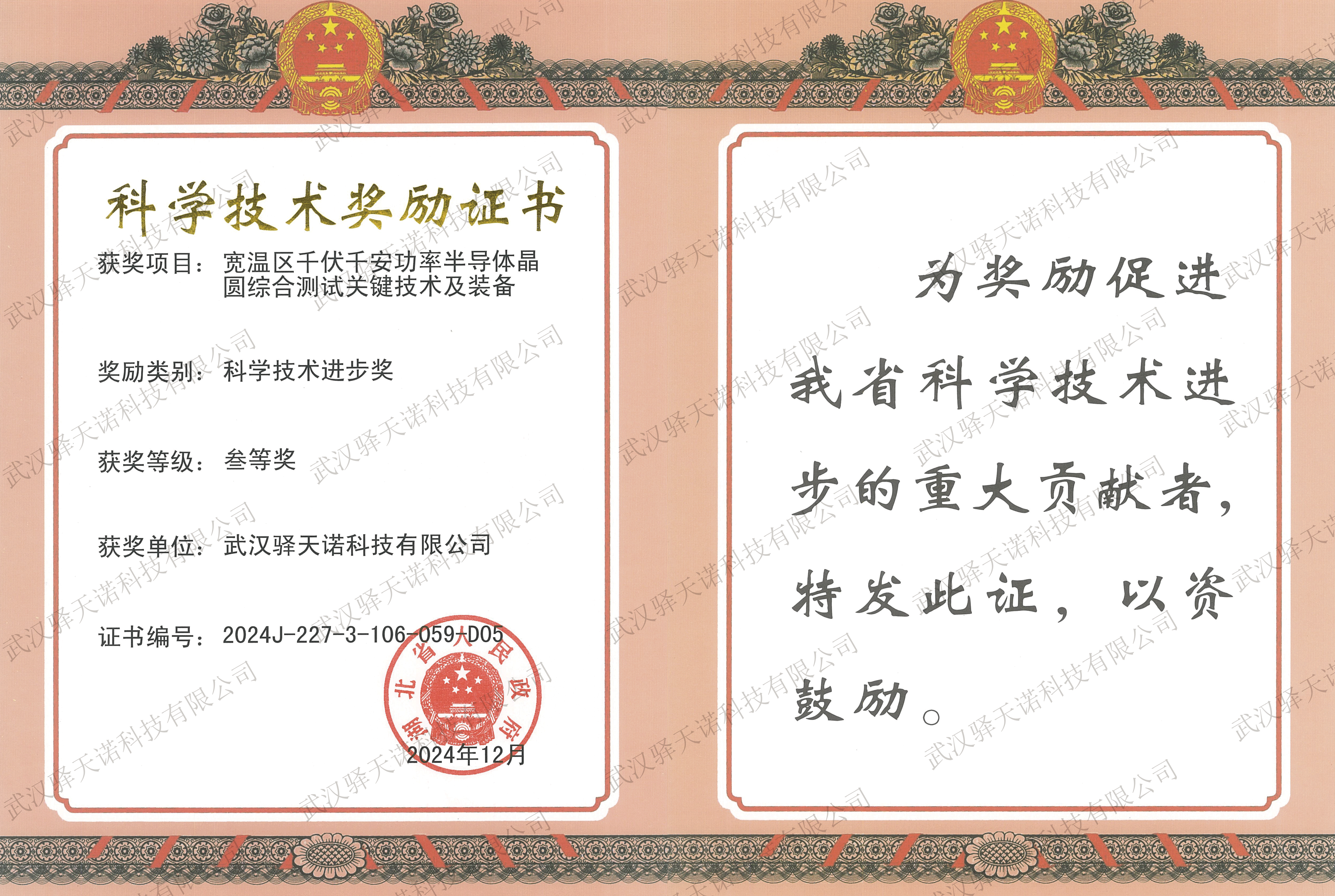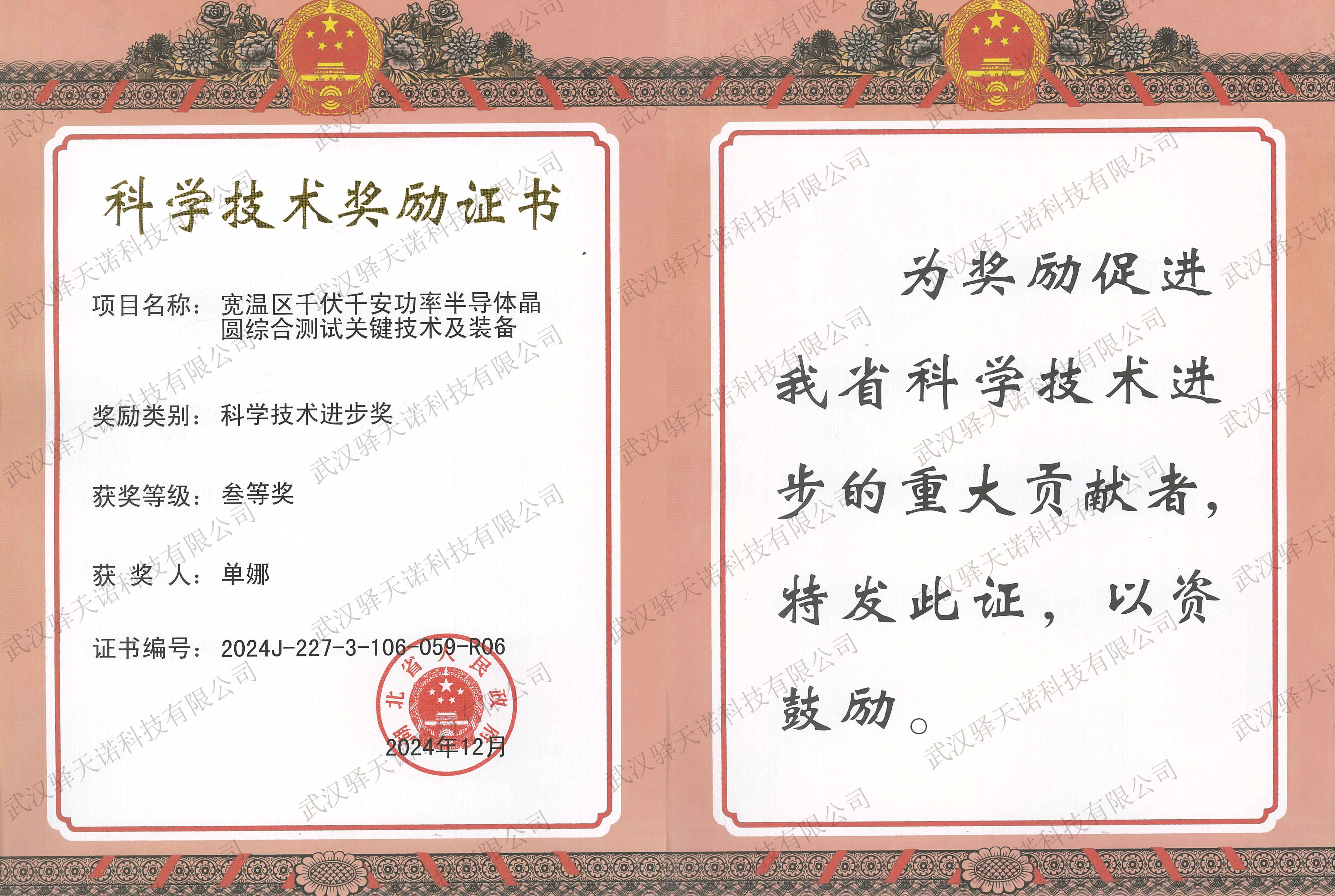 近日,《省人民政府关于2024年度湖北省科学技术奖励的决定》公告显示——经省科学技术奖励评审委员会评审、省科学技术奖励委员会审议,省人民政府决定,对为湖北省科学技术进步、经济社会发展作出突出贡献的科学技术人员和组织给予奖励。驿天诺参与的“宽温区千伏千安功率半导体晶圆综合测试关键技术及装备”项目荣获湖北省科学技术进步奖,董事长单娜个人被评为“省科技进步重大贡献者”。